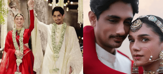 अदिति राव हैदरी लाल रंग के लहंगे में बेहद खूबसूरत नजर आ रही हैं। माथा पट्टी, नथ और हैवी ज्वेलरी के साथ अदिति ने रॉयल लुक को कंप्लीट किया है। वहीं सिद्धार्थ क्रीम कलर की शेरवानी और मोतियों वाली माला पहने दिख रहे हैं।