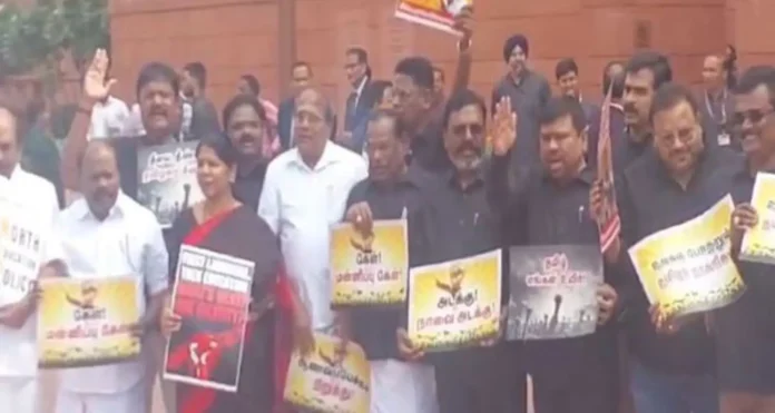 DMK राष्ट्रीय शिक्षा नीति (NEP), विशेष रूप से तीन-भाषा फॉर्मूले का विरोध कर रही है, जिसके बारे में उनका मानना है कि यह तमिलनाडु पर हिंदी थोपने का एक प्रयास है। डीएमके सांसद कनिमोझी ने केंद्र पर तमिलनाडु के बच्चों का भविष्य बर्बाद करने का आरोप लगाया। द्रविड़ मुनेत्र कड़गम (DMK) सांसद कनिमोझी और अन्य डीएमके सांसदों ने मंगलवार को राष्ट्रीय शिक्षा नीति (NEP), तीन-भाषा मुद्दे और तीन-भाषा मुद्दे पर संसद में केंद्रीय शिक्षा मंत्री धर्मेंद्र प्रधान की टिप्पणी के खिलाफ संसद में विरोध प्रदर्शन किया।