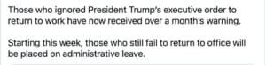 Musk ने सोशल मीडिया प्लेटफॉर्म X पर लिखा, “राष्ट्रपति ट्रंप के आदेश के बावजूद जो लोग अब तक ऑफिस नहीं आए हैं, उन्हें काफी समय दिया गया। इस हफ्ते से जो अभी भी दफ्तर नहीं लौटेंगे, उन्हें प्रशासनिक अवकाश पर रखा जाएगा।”