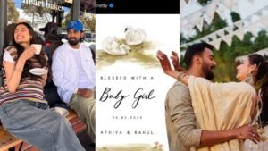Athiya Shetty ने इंस्टाग्राम पर एक खूबसूरत तस्वीर पोस्ट कर अपने मातृत्व की घोषणा की। तस्वीर में दो हंसों की पेंटिंग थी, जिसमें लिखा था, “Blessed with a baby girl” (बेटी के जन्म से धन्य)। इस पोस्ट के बाद से ही फैंस, सेलिब्रिटीज और क्रिकेटर्स की ओर से बधाइयों का सिलसिला जारी है।