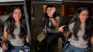 अपने लुक को पूरा करने के लिए, Radhika ने छोटे स्टार डिज़ाइन वाले हूप ईयररिंग्स पहने और कंधे पर एक एलीगेंट हैंडबैग कैरी किया। उनके मेकअप में भी सादगी की झलक थी—हल्का न्यूड आईशैडो, मस्कारा से संवारी पलकें, हल्की ब्लश की परत और सॉफ्ट न्यूड लिपस्टिक, जिससे उनका नैचुरल ग्लो और भी उभरकर सामने आया।