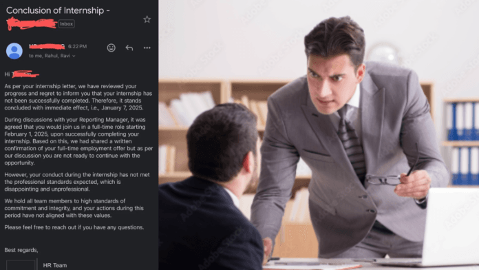 एक Reddit उपयेगकर्ता ने इस घटना का हाल बताते हुए दो ईमेल के स्क्रीनशॉट भी पोस्ट किए। पहला ईमेल संस्थापक का था, जिसने इंटर्न पर “UNPROFFESIONAL BEHAVIOUR” का आरोप लगाया और इसे उसकी इंटर्नशिप समाप्त करने का कारण बताया। संस्थापक ने फुल टाइम जॉब ऑफर का भी उल्लेख किया, और कहा कि इंटर्न ने पद स्वीकार करने से इनकार कर दिया था।