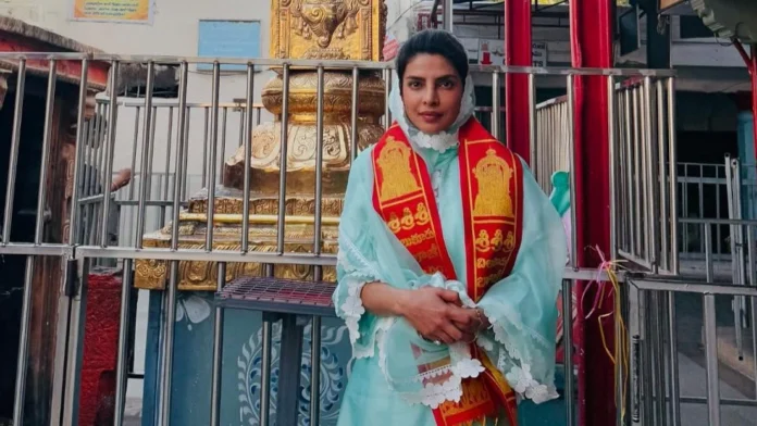 प्रियंका चोपड़ा ने फिरोजी कलर का सूट पहना हुआ है। मंदिर परिसर में उन्होंने दुपट्टा सिर पर ओढ़ा हुआ है। मीडिया रिपोर्ट्स में ऐसा दावा किया जा रहा है कि प्रियंका चोपड़ा एसएस राजामौली के साथ तेलुगु फिल्म में काम कर रही हैं। इसी फिल्म के सिलसिले में वे भारत आई हैं। हालांकि, इन खबरों की अभी पुष्टि नहीं हुई है।