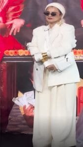 Rekha ने इस खास मौके पर एक बेहद स्टाइलिश ऑल-व्हाइट पैंटसूट पहना, जिसमें सफेद साटन ब्लाउज, ब्लेजर और वाइड-लेग ट्राउज़र शामिल था। लेकिन असली ग्लैमर उनके एक्सेसरीज़ ने जोड़ा। उन्होंने बड़े काले सनग्लासेस, सुनहरे झुमके और सफेद कैप पहनी, जिससे उनका लुक और भी ज्यादा क्लासी लगने लगा।