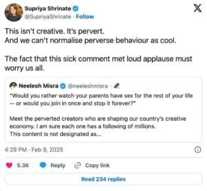 कई सोशल मीडिया यूजर्स ने सूचना एवं प्रसारण मंत्री अश्विनी वैष्णव से इस पर कार्रवाई करने की मांग की। एक यूजर ने लिखा, “यह कंटेंट बच्चों और युवाओं पर बुरा असर डालेगा।” वहीं, कुछ लोगों ने Ranveer Allahbadia की आलोचना करते हुए कहा कि इस तरह की घटिया बातें अब मनोरंजन के नाम पर परोसी जा रही हैं।